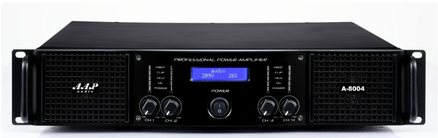 Mặt trước của cục đẩy công suất AAP A-8004 bao gồm công tắc nguồn, núm điều chỉnh được bố trí khoa học cùng với màn hình hiển thị thông minh giúp người dùng theo dõi và kiểm soát được thiết bị. Mặt sau là các cổng kết nối có chú thích rõ ràng giúp người dùng dễ dàng kết nối với các thiết bị âm thanh khác.