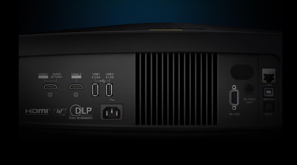 | Kết nối | HDMI-1 (2.0b/HDCP2.2/Audio Return+), HDMI-2 (2.0b/HDCP2.2), USB Type A-1 (2.0/Power Supply 2.0A), USB Type A-2 (2.0/Power Supply 1.5A), cổng điều khiển RS-232, 3D Sync out, LAN (RJ45), và Audio out (S/PDIF) |