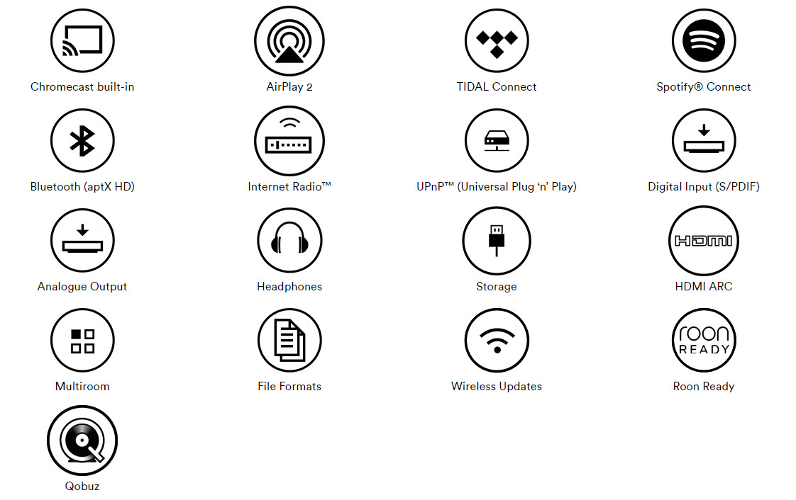 Chromecast Built-In, Apple AirPlay2, TIDAL, TIDAL Connect, Spotify® Connect, Qobuz, Bluetooth® (AptX HD), Internet Radio, UPnP™ (hi-res streaming), Roon Ready. |